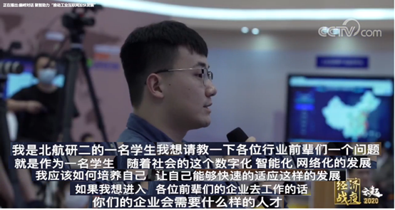 2020年5月28日,由央视网和中国信息通信研究院、工业互联网产业联盟等共同策划推出全国两会“《经济战疫-云起》——推动工业互联网加快发展”特别节目。我校437ccm必赢国际官方网站系统仿真与智慧制造系2019级研究生孔宇升作为部属院校青年学生代表受邀参加。