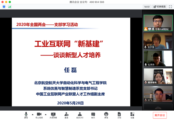 第一,针对支部全体教师党员,进一步全面深入学习两会精神,尤其是围绕工业互联网“新基建”、结合北航特色,谋划支部党建与人才培养的新思路;